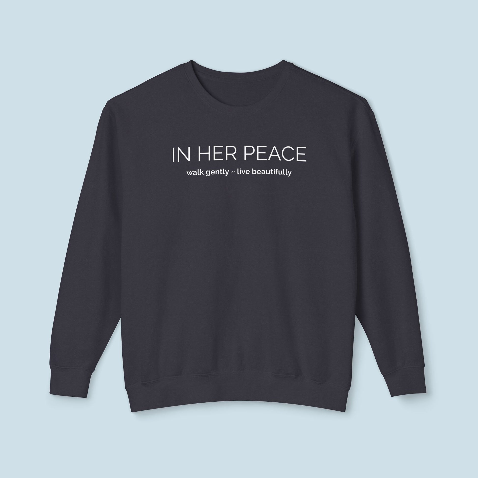 This unisex lightweight crewneck sweatshirt features the inspiring quote 'In Her Peace, walk gently ~ live beautifully'. With its relaxed fit and 100% ring-spun cotton fabric, this sweatshirt offers comfort and style. Perfect for those looking for a cozy yet meaningful addition to their wardrobe. Ideal for anyone seeking peace and beauty in their daily lives.